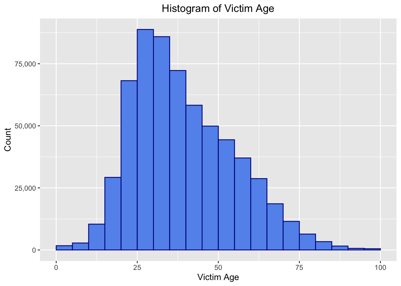 ggplot(df_plot, aes(x=Vict.Age)) +geom_histogram(binwidth=5, color="darkblue", fill="cornflowerblue", breaks=c(0,5,10,15,20, 25, 30, 35, 40, 45, 50, 55, 60, 65, 70, 75, 80, 85, 90, 95, 100))+labs(title="Histogram of Victim Age",x="Victim Age", y ="Count")+theme(plot.title =element_text(hjust=0.5))+scale_y_continuous(labels = scales::comma) #so that the y axis has readable y ticks
