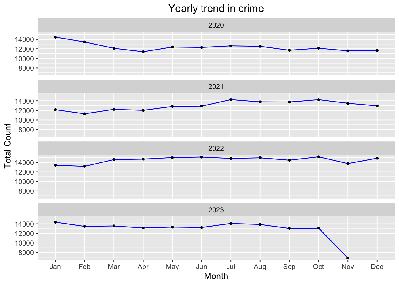 ggplot(df_covid, aes(Month_Occurred, total_per_month)) +geom_line(color ='blue', breaks=c(1,2,3,4,5,6,7,8,9,10,11,12)) +geom_point(size =1) +facet_wrap(.~Year_Occurred,ncol=1)+labs(title="Yearly trend in crime",x="Month", y ="Total Count")+theme(plot.title =element_text(hjust=0.5))+scale_x_discrete(name ="Month", limits=c('Jan','Feb','Mar','Apr','May','Jun','Jul','Aug','Sep','Oct','Nov','Dec'))