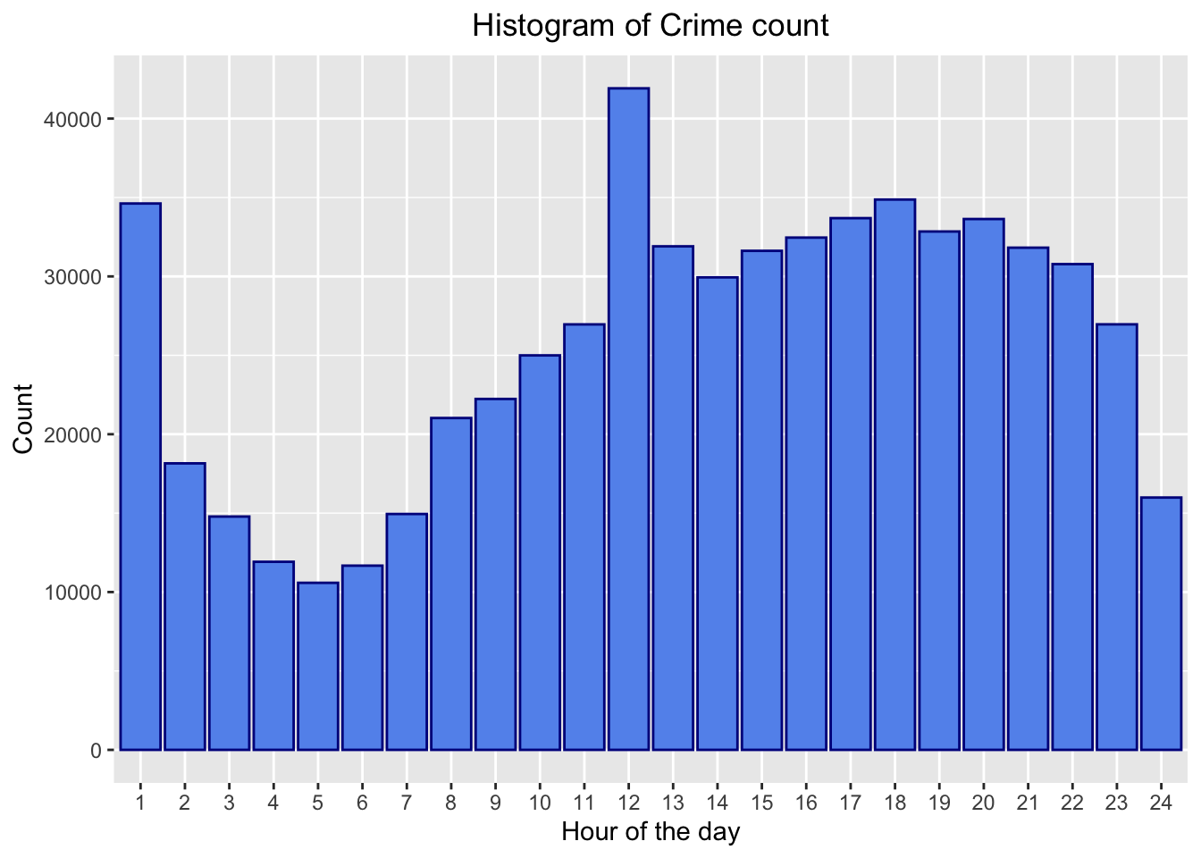 As expected, there is a dip in the crime committed during the early hours of the morning (from 3 AM to 7 AM), after which crime instances continuously rise and stay at that range till 10 PM. The hour before midnight sees a dip in crime, but then after midnight, the crime peaks to around 35,000 total counts (which is the second highest amount throughout the day). An anomaly we notice is clearly the huge peak in time of occurrence of crime at noon, which we also suspect could be because of lack of reporting time in some crime cases, for which the police department may enter 12:00 as the dummy time, and hence it falls in this bin.