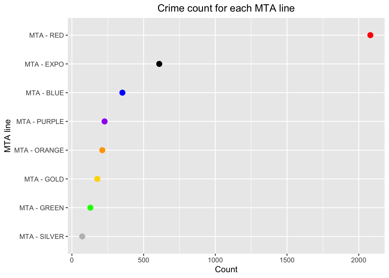 custom_colors <-c("MTA - RED"="red", "MTA - BLUE"="blue", "MTA - GREEN"="green", "MTA - GOLD"="gold","MTA - SILVER"="grey", "MTA - PURPLE"="purple", "MTA - ORANGE"="orange", "MTA - EXPO"="black") #color coding the linesggplot(df_mta, aes(x = count, y =fct_reorder(railline, count))) +geom_point(size =3, color = custom_colors[df_mta$railline]) +scale_color_manual(values = custom_colors) +labs(title="Crime count for each MTA line",x="Count", y ="MTA line")+theme(plot.title =element_text(hjust=0.5), legend.position ="none" )