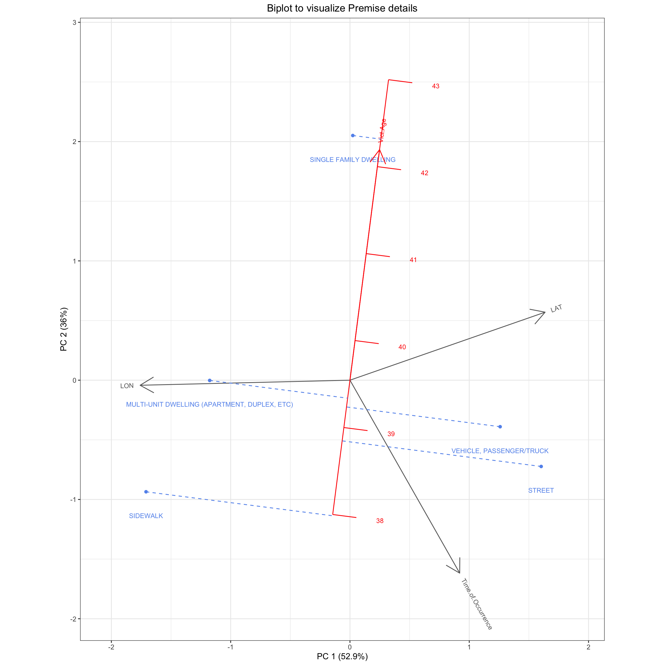 df_premise=df_plot[df_plot$Premis.Desc %in%c('SINGLE FAMILY DWELLING', 'STREET', 'MULTI-UNIT DWELLING (APARTMENT, DUPLEX, ETC)','SIDEWALK','VEHICLE, PASSENGER/TRUCK'), ] #filtering only the top 6 premisesdf_premise$Time.of.Occurrence <-as.numeric(substr(df_premise$Time.of.Occurrence, 1, 2)) *100+as.numeric(substr(df_premise$Time.of.Occurrence, 4, 5)) #so that we can work with a continuous variable, since right now it is categoricallibrary(redav)df_premise<-df_premise %>%group_by(Premis.Desc) %>%summarise(Time.of.Occurrence =mean(Time.of.Occurrence), Vict.Age =mean(Vict.Age),LAT=mean(LAT), LON=mean(LON)) #for ease of biplot plotting, we compute the mean of each feature