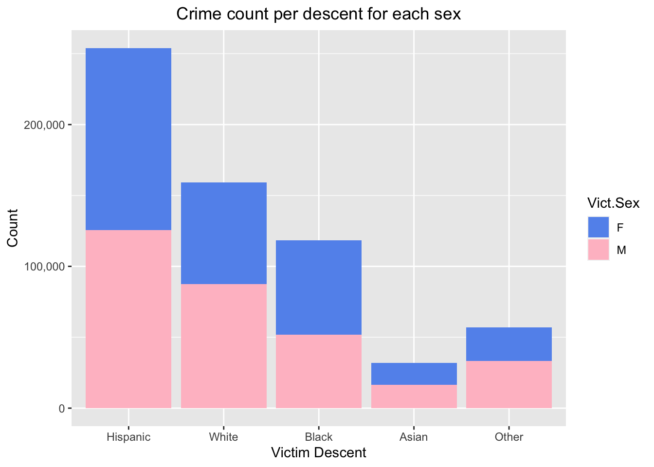 df_sand<-df_plotdf_sand<-df_sand %>%group_by(Vict.Descent, Vict.Sex) %>%summarise(count=n(),.groups ='drop') #groupby descent and sex, and count the total in each combodf_sand$Vict.Descent=factor(df_sand$Vict.Descent, levels=c('H','W','B','A','O')) #reordering the factor levels in decreasing order of freqggplot(df_sand, aes(fill=Vict.Sex, y=count, x=Vict.Descent)) +geom_bar(position="stack", stat="identity")+labs(title="Crime count per descent for each sex",x="Victim Descent", y ="Count")+theme(plot.title =element_text(hjust=0.5))+scale_y_continuous(labels = scales::comma)+scale_fill_manual(values=c('cornflowerblue', 'pink'))+scale_x_discrete(labels=c('Hispanic', 'White', 'Black', 'Asian','Other')) #labeling with meaningful names