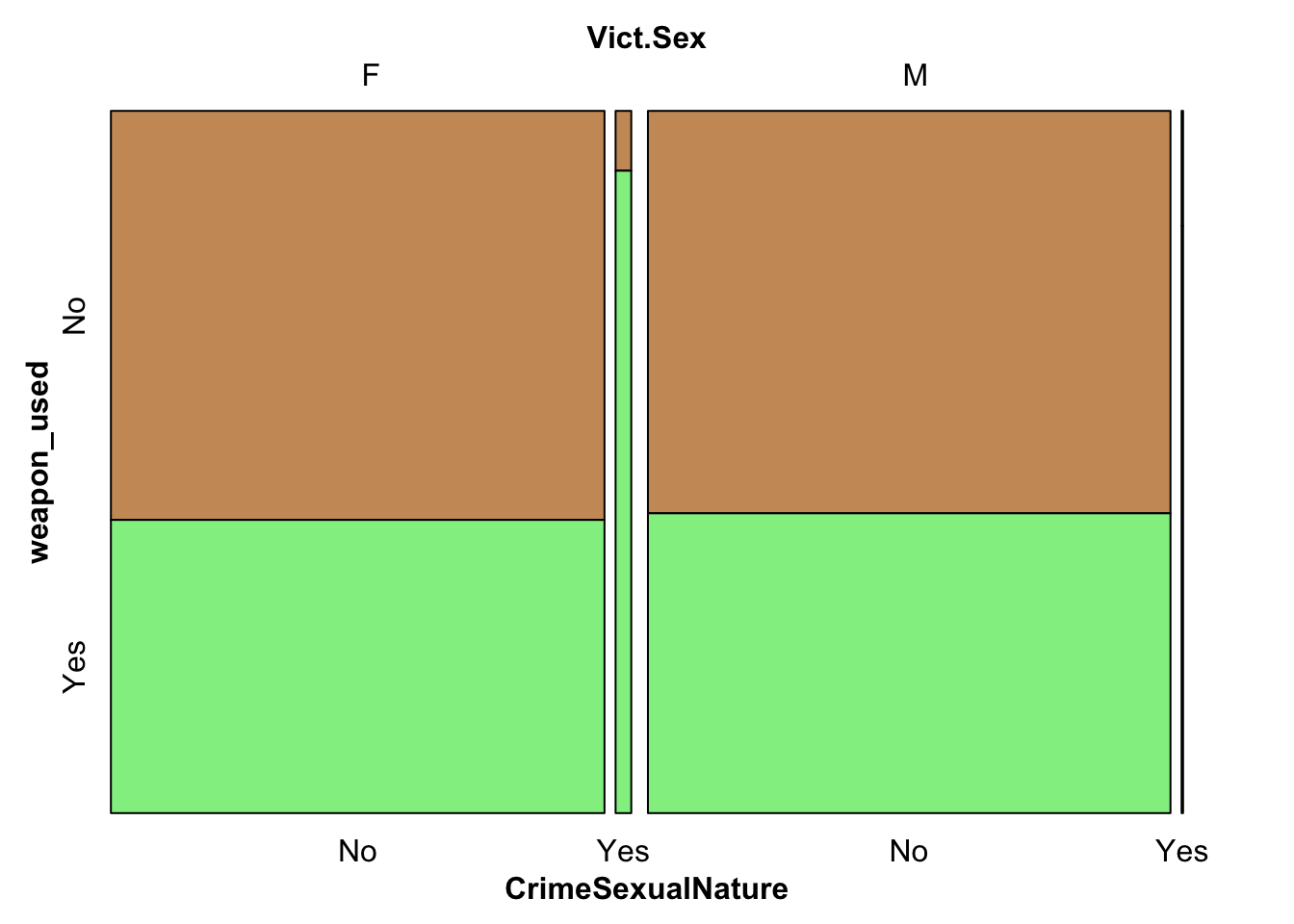 df_weapon<-df_plotdf_weapon$weapon_used <-ifelse(df_weapon$Weapon.Used.Cd >0, "Yes", "No") #making a new column based on the original onedf_weapon<-subset(df_weapon, Crm.Cd.Desc !="INCEST (SEXUAL ACTS BETWEEN BLOOD RELATIVES)"&Crm.Cd.Desc !="BEASTIALITY, CRIME AGAINST NATURE SEXUAL ASSLT WITH ANIM") #rare instances, we do not consider these entriesdf_weapon$CrimeSexualNature <-ifelse(grepl("sex|rape", df_weapon$Crm.Cd.Desc, ignore.case =TRUE), "Yes", "No")library(grid)icecreamcolors <-c("#cc9966", "lightgreen")vcd::mosaic(weapon_used~ Vict.Sex+ CrimeSexualNature, df_weapon,direction =c("v","v" ,"h"),highlighting_fill = icecreamcolors)