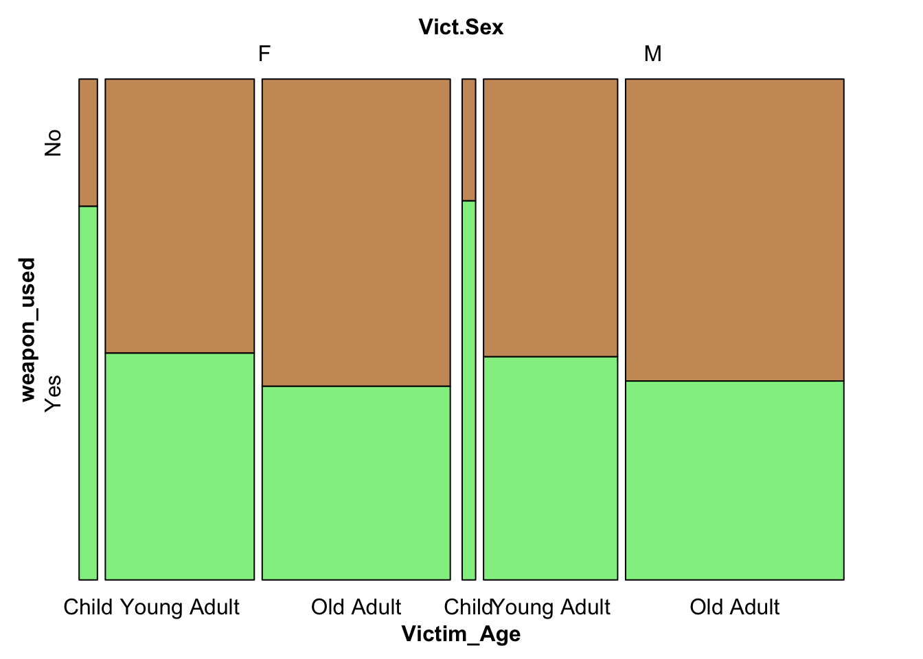 df_weapon$Victim_Age <-case_when( df_weapon$Vict.Age <=18~'Child', between(df_weapon$Vict.Age, 19, 34) ~'Young Adult', df_weapon$Vict.Age >=35~'Old Adult') #classifying ages into three categoriesdf_weapon <- df_weapon %>%filter(Victim_Age=='Child'| Victim_Age=='Young Adult'|Victim_Age=='Old Adult') df_weapon$Victim_Age=factor(df_weapon$Victim_Age, levels=c('Child','Young Adult','Old Adult'))icecreamcolors2 <-c ("#cc9966", "lightgreen")vcd::mosaic(weapon_used~ Vict.Sex+Victim_Age , df_weapon,direction =c("v","v","h"),highlighting_fill = icecreamcolors2) #mosaic plot, wre the weapon used is the dependent variable