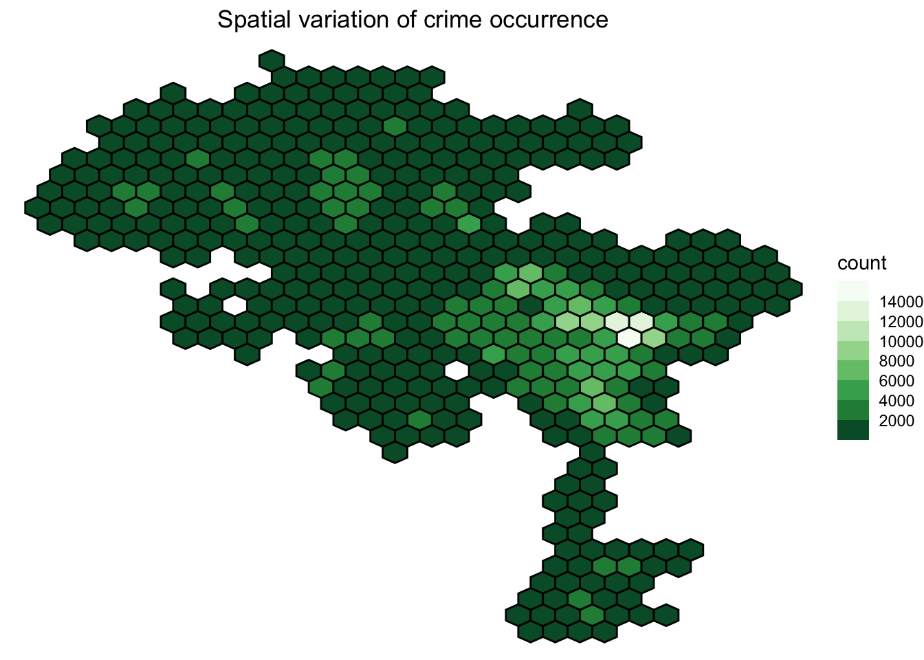 df_area <- df_plot %>%filter(LON !=0| LAT !=0) #excluding these entriesggplot() +geom_hex(data=df_area, #hexmapmapping =aes(x=LON, y=LAT), bins=30, color="black")+scale_fill_fermenter(n.breaks=10,palette ="viridis")+theme_void()+labs(title="Spatial variation of crime occurrence")+theme(plot.title =element_text(hjust=0.5))