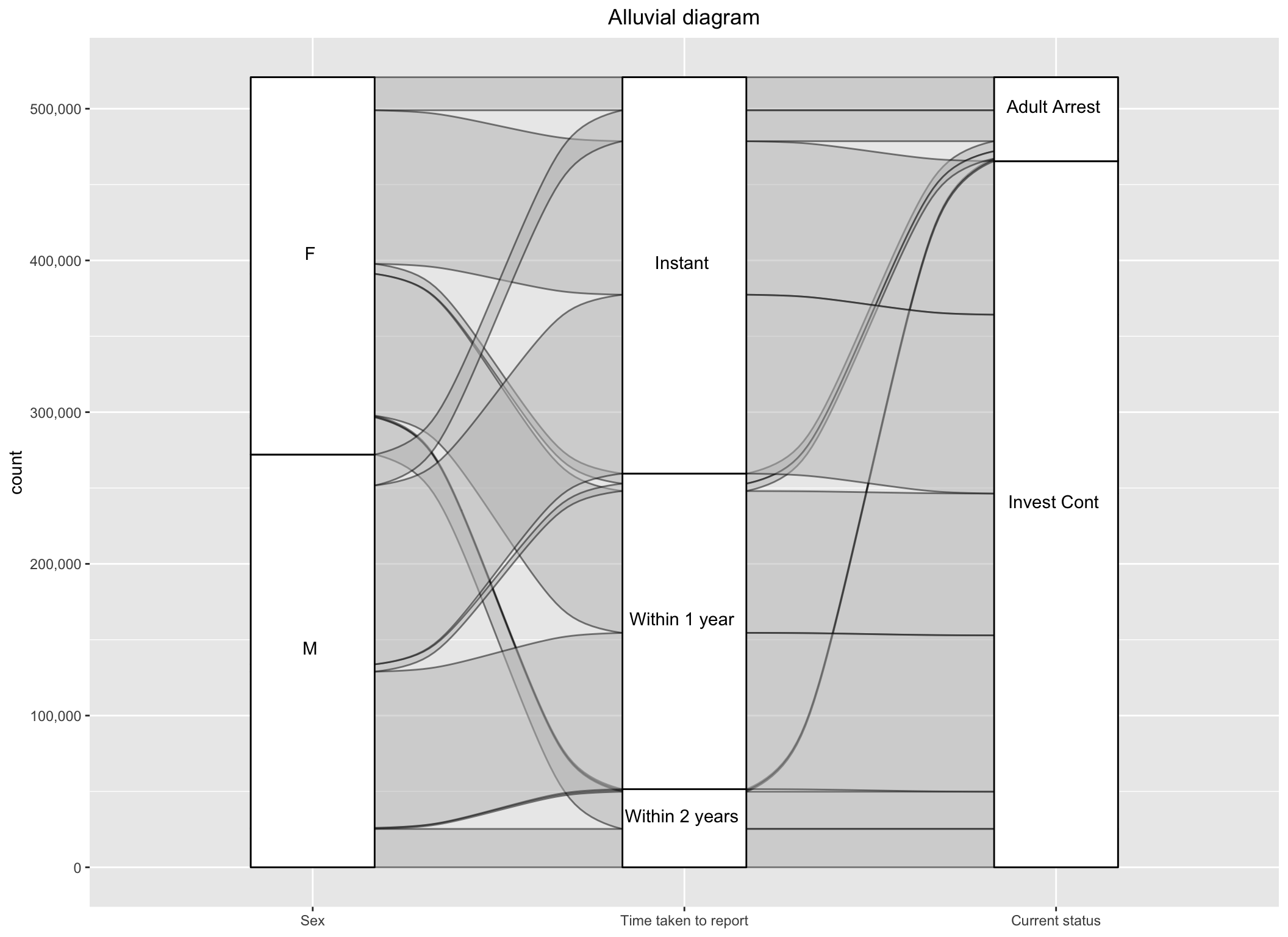 To investigate this aspect of crime involving fear or shame of a victim in reporting crime, we will plot an Alluvial diagram that represents the flow of crime instances across Victim Sex, the difference in date reported and date occurred of the crime, and the status of the crime that was reported (whether the investigation is still continuing or the adult has been arrested). Due to less cases in juvenile perpetrators and unknowns and the ambiguity of ‘Adult Other’ category, we will focus only on the two categories of status of crime. The difference in dates reported have been classified into three options: Instant (where the crime is instantly reported on the same exact day as committed), 1 year (when the difference is less than 365 days), and 2 years (when the difference is less than 730 days but more than a year).